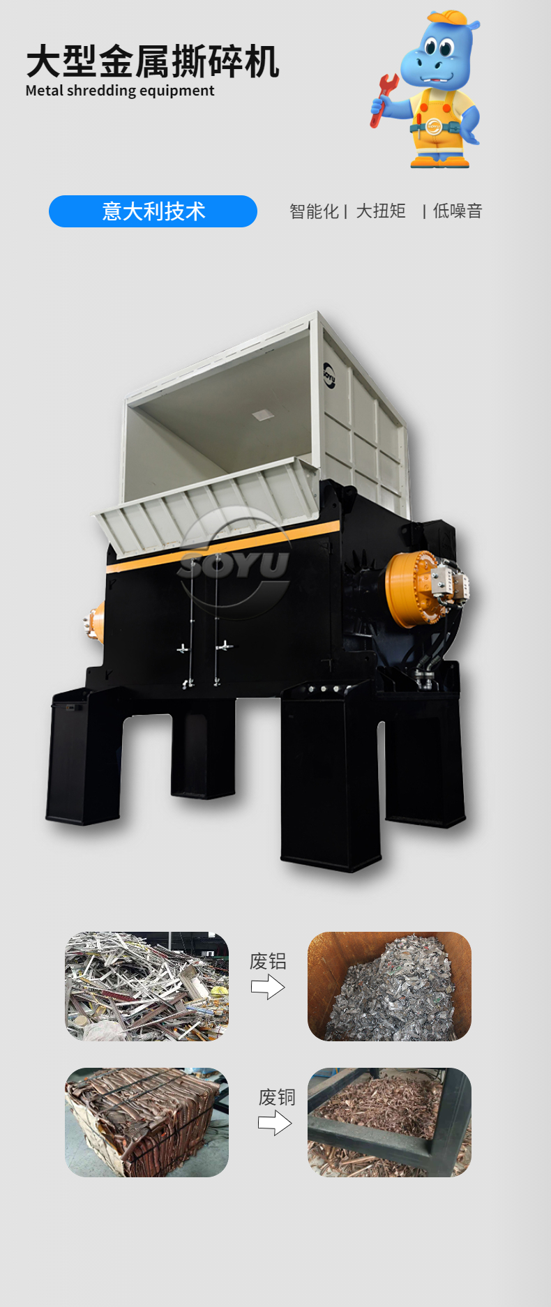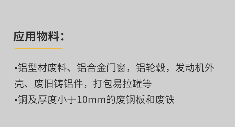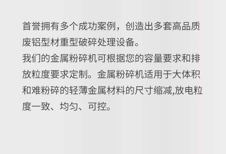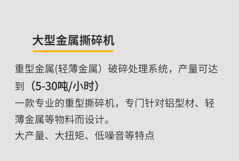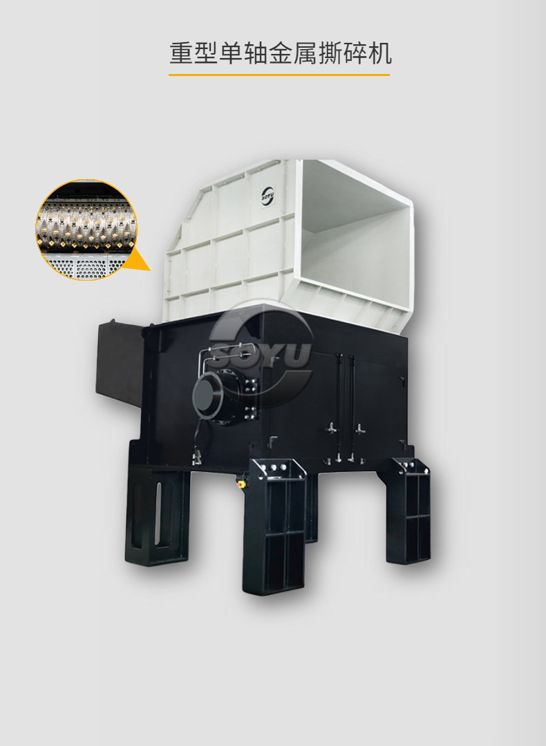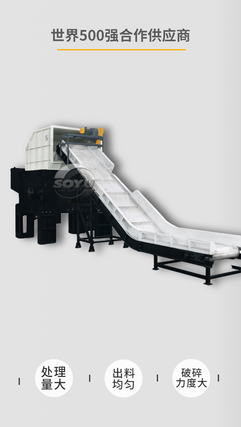 本機采用行星齒輪減速機驅(qū)動,刀片采用高強度合金鋼制成,有較強的耐磨性和較高的強度等特點,軸之間差速運轉(zhuǎn),有撕扯、擠壓、咬合等功能。電氣部分采用西門子電氣元件編程控制,具有自動檢測過載保護等功能。專為破碎各種鋁型材及輕薄金屬物料設(shè)計,適合各種大體積,難破碎的壓塊的或散件的鋁型材物料細化,具有出料均勻、大小可控等優(yōu)點,適合撕碎的物料有:打包鋁、鋁泊、鋁材、鋁條、輕薄鋼料、輕薄鐵料等各種廢金屬物料。效率高、低轉(zhuǎn)速、大轉(zhuǎn)矩、低噪音
