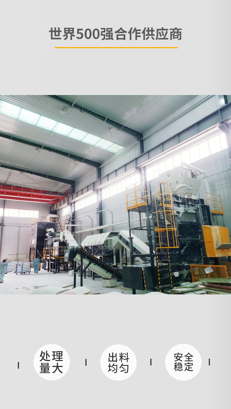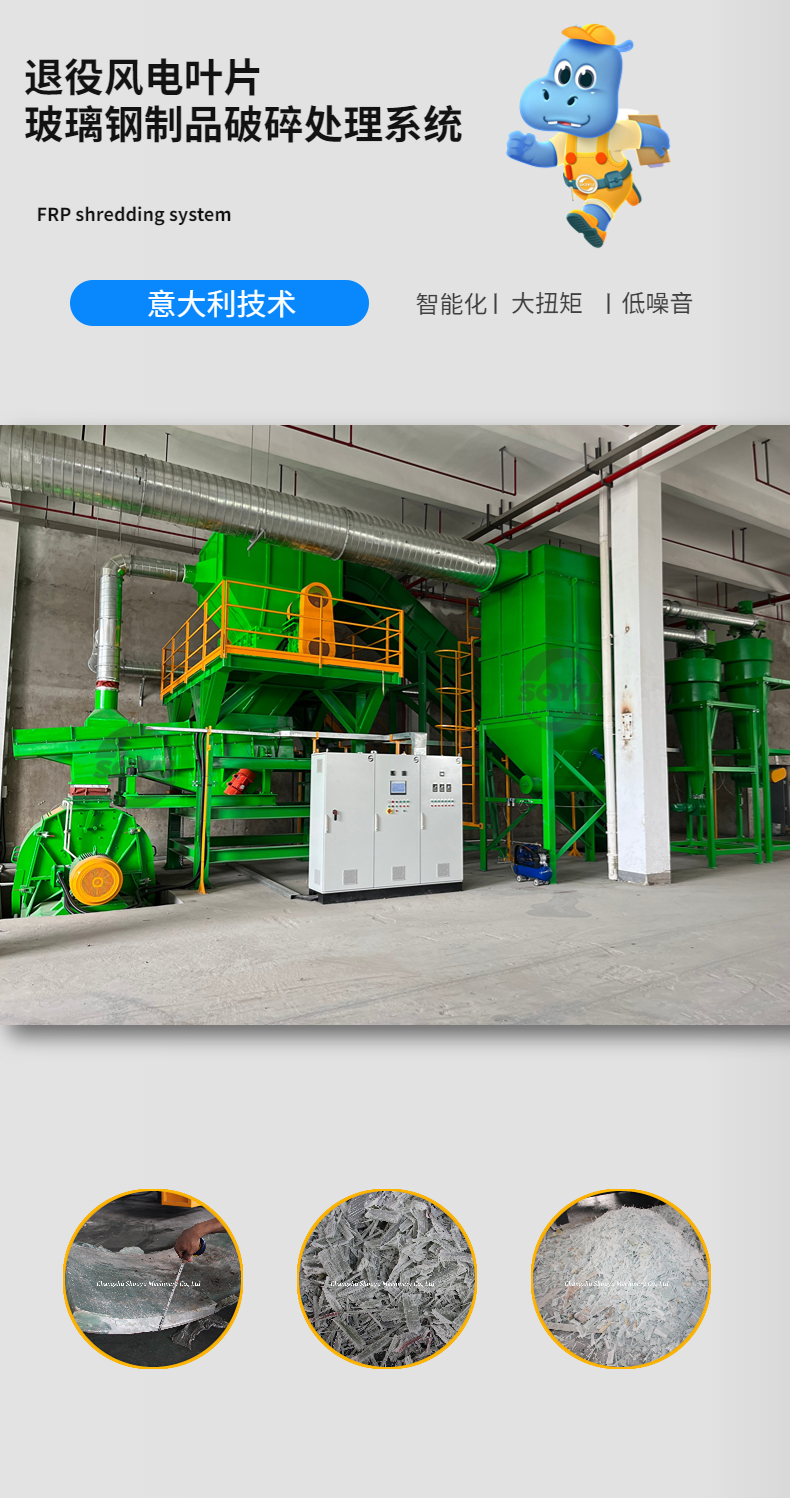 針對(duì)退役風(fēng)電葉片(玻璃鋼)材質(zhì)物料,首譽(yù)機(jī)械提供專業(yè)的退役風(fēng)電葉片資源化成套處置系統(tǒng),為批量無害化處置退役風(fēng)機(jī)葉片探索出一條可行性和經(jīng)濟(jì)性兼顧的技術(shù)途徑。