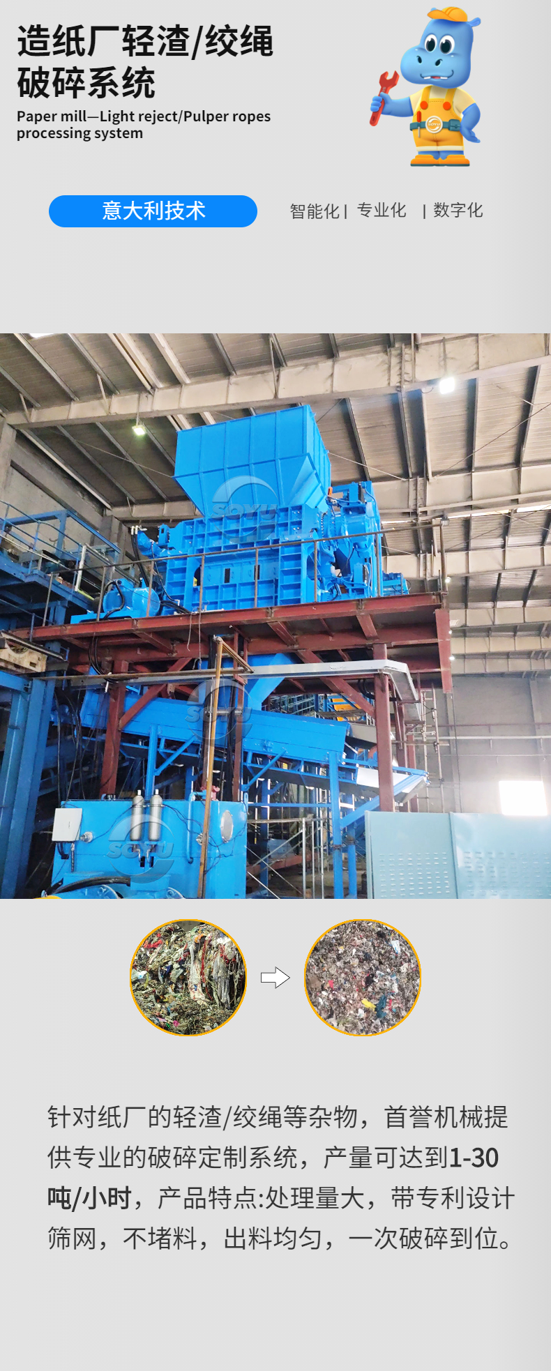 專業(yè)針對(duì)紙廠輕渣,絞繩等廢棄物而設(shè)計(jì),整機(jī)技術(shù)來(lái)源于歐洲,采用微電腦(PC)自動(dòng)控制,設(shè)啟動(dòng)、停止、反轉(zhuǎn)及超載自動(dòng)反轉(zhuǎn)控制功能,具有低速、大轉(zhuǎn)矩、低噪音等特點(diǎn),軸承座采用對(duì)開型式,拆裝換刀容易方便適合撕碎特大、特厚難碎物料。